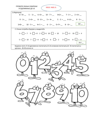 __ 5 - 1= __ 6 +3= __ 10 - 7 = __ 8+2= __ 7 - 3 = __ 2 + 6= __ 9 - 1= __ 2 +3= __ 8 - 0 = __ 3 + 4= __ 5 - 3 = ___ 4 +2= __ 8 - 3 = __ 2+0= __ 10 - 5 = __ 4+ 5 = __ 6 - 2 = __ 0 +7= __ 8 - 8 = __ 2 .Упиши потребне бројеве у квадратиће 3 + 2= = 7 9 - 3 = = 0 2 +2= = 6 10 - = 10 3 + = = 3 10 - = 4 5 + 2= = 10 7 - = 4 3 + = 5 6 - = 2 3 + = = 8 8 - = 4 Бодовна листа 0-14 дјелимично постигнуто,15-22 углавном постигнуто,22- 35 постигнуто у цјелини , 36-44 истиче се МОЈЕ ИМЕ ЈЕ: ПРОВЈЕРА ЗНАЊА САБИРАЊЕ И ОДУЗИМАЊЕ ДО 10 20/ __ 24 / __