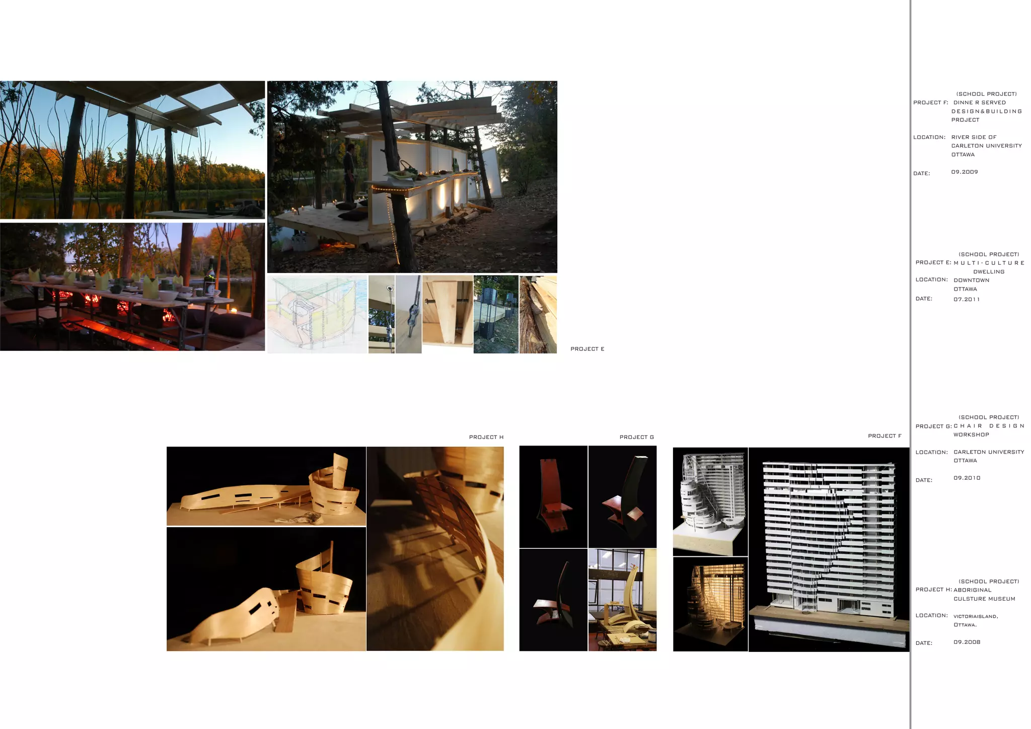 The document outlines four school projects - Project E, Project F, Project G, and Project H. It provides the location and date for each project. Project E was a multi-culture dwelling project located in downtown Ottawa from July 2011. Project F was a chair design workshop at Carleton University in Ottawa from September 2010. Project G was an Aboriginal culture museum on Victoria Island, Ottawa from September 2008. Project H was a dinner served design and building project on the river side of Carleton University in Ottawa from September 2009.