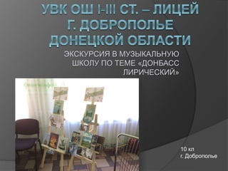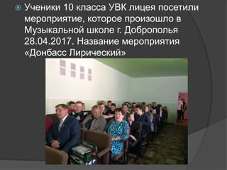 Ученики 10 класса УВК лицея посетили музыкальную школу в г. Доброполье 28 апреля 2017 года для участия в мероприятии «Донбасс лирический», посвященном 85-летию основания Донецкой области. В ходе мероприятия они слушали выступления учителей и учеников, а также стихи местных поэтов. Композиция сочетала литературу и музыку, подчеркивая культурное наследие региона.