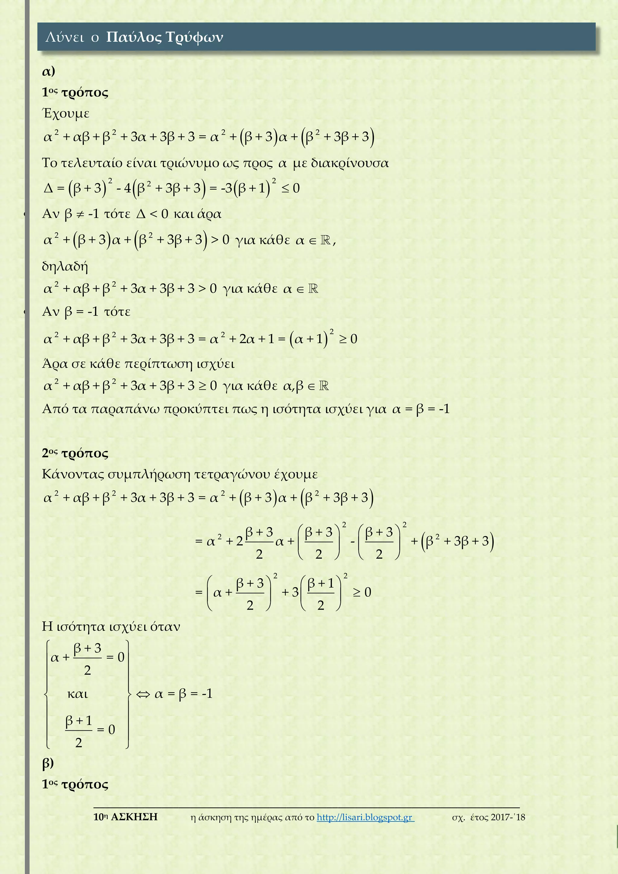 άσκηση της ημέρας από το http://lisari.blogspot.gr σχ. έτος 2017-΄18 α) 1ος τρόπος Έχουμε 2 2 2 2 α + αβ + β + 3α + 3β + 3 = α + β + 3 α + β + 3β + 3 Το τελευταίο είναι τριώνυμο ως προς α με διακρίνουσα 2 22 Δ = β + 3 - 4 β + 3β + 3 = -3 β + 1 0 Αν β -1 τότε Δ < 0 και άρα 2 2 α + β + 3 α + β + 3β + 3 > 0 για κάθε α , δηλαδή 2 2 α + αβ + β + 3α + 3β + 3 > 0 για κάθε α Αν β = -1 τότε 22 2 2 α + αβ + β + 3α + 3β + 3 = α + 2α + 1 = α + 1 0 Άρα σε κάθε περίπτωση ισχύει 2 2 α + αβ + β + 3α + 3β + 3 0 για κάθε α,β Από τα παραπάνω προκύπτει πως η ισότητα ισχύει για α = β = -1 2ος τρόπος Κάνοντας συμπλήρωση τετραγώνου έχουμε 2 2 2 2 2 2 2 2 2 2 α + αβ + β + 3α + 3β + 3 = α + β + 3 α + β + 3β + 3 β + 3 β + 3 β + 3 = α + 2 α + - + β + 3β + 3 2 2 2 β + 3 β + 1 = α + + 3 0 2 2 Η ισότητα ισχύει όταν β + 3 α + = 0 2 και α = β = -1 β + 1 = 0 2 β) 1ος τρόπος Λύνει ο Παύλος Τρύφων