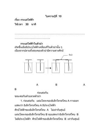 ใบความรู้ที่ 10<br />เรื่องกระแสไฟฟ้า ใช้เวลา 30 นาที<br /> …………………………………………………………………………………………………………..<br />กระแสไฟฟ้าในตัวนำ เกิดขึ้นเมื่อมีประจุไฟฟ้าเคลื่อนที่ในตัวนำนั้น ๆ เนื่องจากปลายทั้งสองของตัวนำมีความต่างศักย์<br /> <br /> <br /> A B A B<br /> ก่อนต่อกัน ขณะต่อกันด้วยลวดตัวนำ<br />1. ก่อนต่อกัน แผ่นโลหะของอิเล็กโทรสโคบ A กางออก แสดงว่า อิเล็กโทรสโคบ A มีประจุไฟฟ้า ศักย์ไฟฟ้าของอิเล็กโทรสโคบ A ไม่เท่ากับศูนย์ แผ่นโลหะของอิเล็กโทรสโคบ B หุบแสดงว่าอิเล็กโทรสโคบ B ไม่มีประจุไฟฟ้า ศักย์ไฟฟ้าของอิเล็กโทรสโคบ B เท่ากับศูนย์<br />2. ขณะที่ต่อจานโลหะของอิเล็กโทรสโคบ A และอิเล็กโทรสโคบ B ด้วยลวดตัวนำ แผ่นโลหะอิเล็กโทรสโคบ A กางออกแต่กางน้อยกว่าเดิมแสดงว่าโลหะอิเล็กโทรสโคบ A มีประจุไฟฟ้าลดลง และแผ่นโลหะของอิเล็กโทรสโคบ B ก็กางออกเท่ากับการกางของแผ่นโลหะอิเล็กโทรสโคบ A แสดงว่าอิเล็กโทรสโคบ B มีประจุไฟฟ้า ดังนั้น<br /> 2.1 ถ้าอิเล็กโทรสโคบ A และอิเล็กโทรสโคบ B มีความต่างศักย์ เมื่อต่ออิเล็กโทรสโคบ <br />A และอิเล็กโทรสโคบ B ด้วยลวดตัวนำประจุไฟฟ้าจะเคลื่อนที่ระหว่างอิเล็กโทรสโคบทั้งสอง <br /> 2. 2 ประจุไฟฟ้าจะหยุดเคลื่อนที่เมื่อศักย์ไฟฟ้าเท่ากัน ( ถ้าอิเล็กโทรสโคบทั้งสองทำจากวัสดุชนิดเดียวกันขนาดเท่ากันความจุย่อมเท่ากัน เมื่อแผ่นโลหะกางออกเท่ากันจึงมีประจุไฟฟ้าเท่ากัน ) <br />แหล่งกำเนิดไฟฟ้า คือเครื่องมือที่เปลี่ยนพลังงานรูปอื่นเป็นพลังงานไฟฟ้า แหล่งกำเนิดไฟฟ้าที่เกี่ยวข้องในชีวิตประจำวันได้แก่ เซลล์ไฟฟ้าเคมี , เครื่องกำเนิดไฟฟ้า ( Dynamo ) เซลล์สุริยะ <br />( Solar cell ) , คู่ควบความร้อน ( Thermo couple ) , แหล่งกำเนิดไฟฟ้าจากสิ่งมีชีวิต ฯ<br />1. เซลล์ไฟฟ้าเคมี เป็นแหล่งกำเนิดไฟฟ้าที่เปลี่ยนพลังงานเคมีเป็นพลังงานไฟฟ้า มีขั้วบวกและขั้วลบ กระแสไฟฟ้าเกิดจากปฏิกิริยาเคมีทำให้เกิดความต่างศักย์ระหว่างขั้วเซลล์แบ่งเป็น 2 ชนิด<br /> 1.1 เซลล์ปฐมภูมิ เมื่อใช้ไปนาน ๆ ความต่างศักย์<br />จะลดลงจนใช้ไม่ได้และต้องทิ้งไปได้แก่ <br /> 1.1.1 เซลล์แบบ สังกะสี-คาร์บอน มีความต่างศักย์<br />ระหว่างขั้วเซลล์ 1.5 , 9 โวลต์ มีรูปร่างทรงกระบอก , สี่เหลี่ยม <br />ใช้กับ ไฟฉาย วิทยุ นาฬิกา เป็นชนิดที่ใช้กันทั่วไป ราคาถูก<br />อายุใช้งานสั้น <br /> <br /> รูป 10.3<br /> <br /> <br /> 1.1.2 เซลล์แบบอัลคาไลน์ มีความต่างศักย์ระหว่างขั้วเซลล์ 1.5 โวลต์ , 9 โวลต์ มีรูปร่างทรงกระบอก , สี่เหลี่ยม , กลมแบน ใช้กับ วิทยุกล้องถ่ายรูป เครื่องคิดเลข อายุการใช้งานยาวนานกว่า แบบเซลล์แบบ สังกะสี-คาร์บอน 2-7 เท่า<br /> 1.1.3 เซลล์แบบลิเธียม มีความต่างศักย์ระหว่างขั้วเซลล์ 2.9 โวลต์ , 3.7 โวลต์ มีรูปร่าง