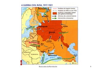 A Guerra Civil(1918-1921) Supón o enfrontamento entre Pyotr N. Wrangel Exercito Branco: - Defende os intereses burgue ses e zaristas. - Recibe apoio exterior. - Practicou o bloqueo económi co a Rusia. - Estivo comandado polo xene ral Pyotr N. Wrangel. León Trostki Exercito Vermello: - Defende a revolución comunista. - Foi unha formación militar moi eficaz. - Gañou o apoio masivo do campesiñado. - Obtivo grandes éxitos mi litares fronte ao inimigo. - Estivo comandado por L. Trostki.