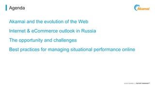 John Dillon, VP and CMO of Akamai, discusses the evolving eCommerce market environment and opportunities and challenges for businesses. He outlines how Akamai delivers around 30% of global web traffic and enables over $250 billion in annual eCommerce. He then discusses best practices for businesses, including measuring customer experiences, optimizing performance across different situations, and securing their online presence from security threats to improve performance and grow revenue opportunities.