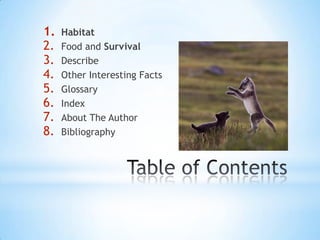 The Arctic fox lives in dens under the snow in the Arctic regions of the Northern Hemisphere, including Europe. They eat small animals like hares and seal pups and try to survive predators like polar bears, wolves, humans, and snowy owls. Arctic foxes have fur that can be white, black, gray, or mixed and a body adapted to leaping and smelling prey and predators. The author wrote about Arctic foxes because they are special to them and they want others to learn more about these animals.