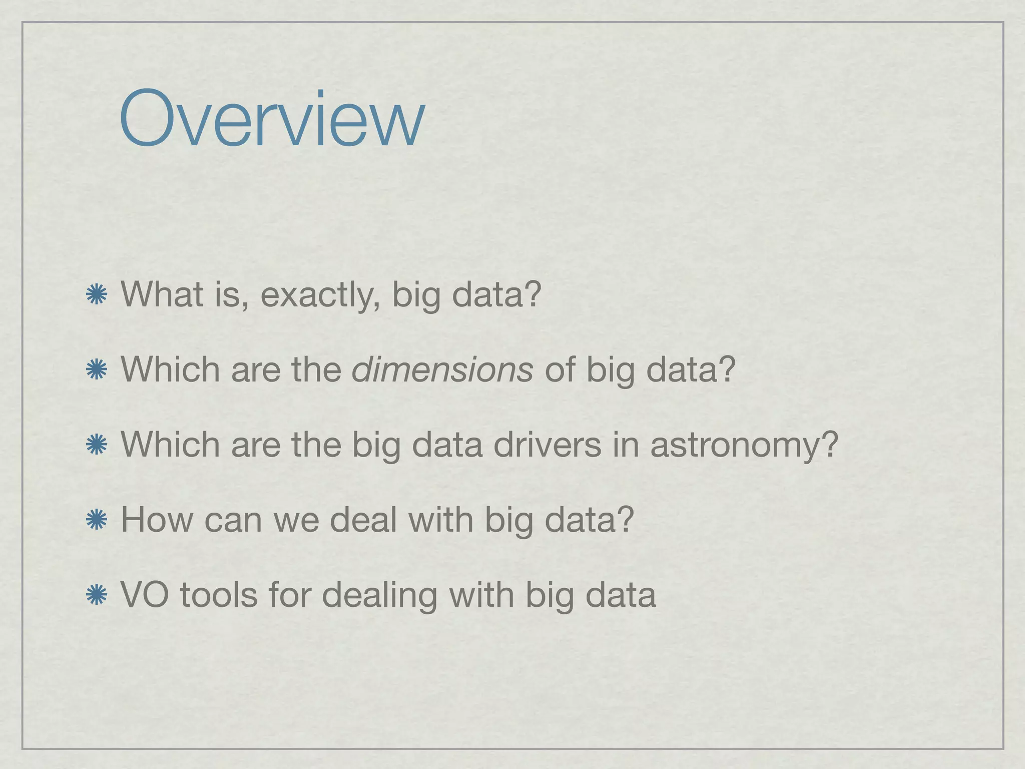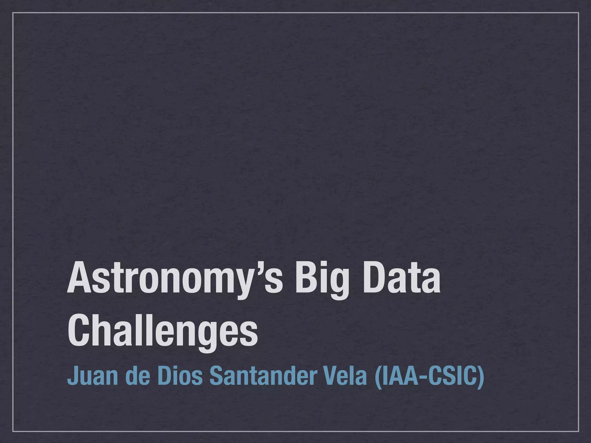 The document discusses the challenges of big data in astronomy, outlining its dimensions and drivers, as well as methods for managing and processing large data sets. It highlights specific astronomy projects like the Large Synoptic Survey Telescope and the Square Kilometre Array, which generate massive data flows requiring advanced processing and storage solutions. The document emphasizes the importance of parallelism and efficient query processing techniques, such as the lambda architecture, to effectively handle the complexities of big data in scientific research.