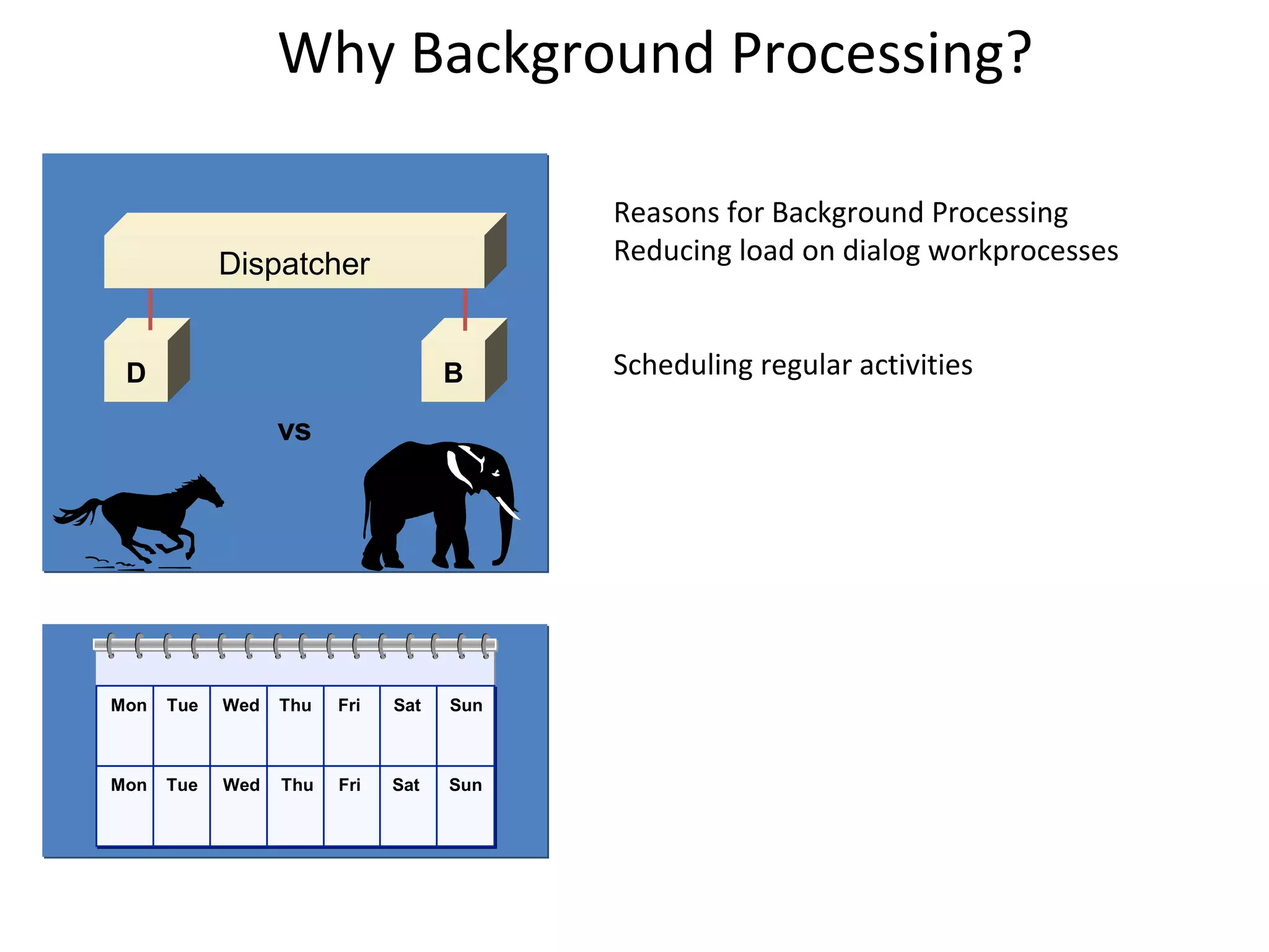 Background processing reduces the load on dialog work processes by scheduling regular activities to run in the background. A background job consists of one or more steps, which can be an ABAP program, external command, or external program. Jobs are assigned priorities and can be triggered by time or event. The Job Wizard provides an easy way to define a job with general information and start conditions. Job monitoring displays job status and logs.