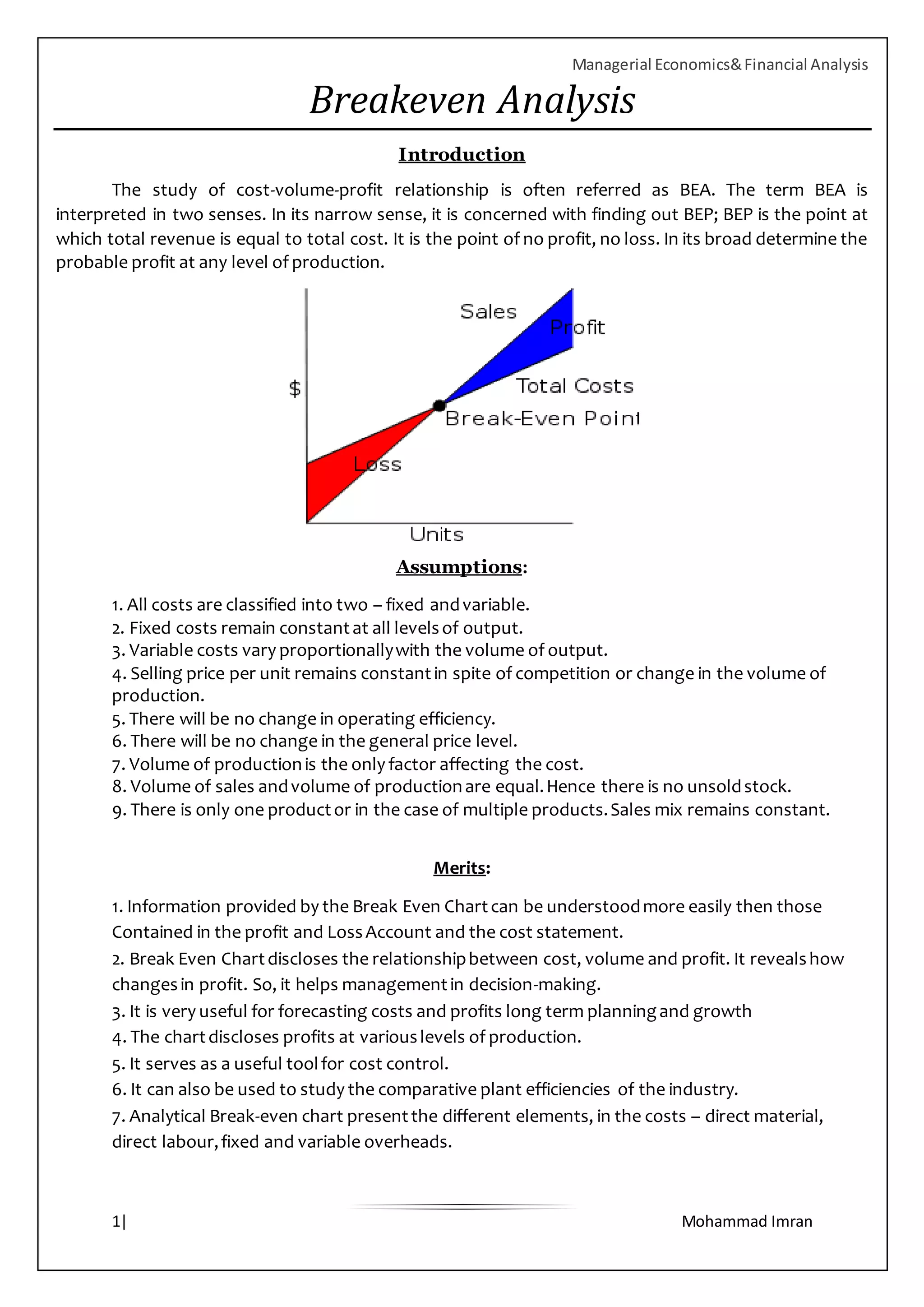 1. Assumptions made in break-even analysis like fixed costs remaining constant and variable costs varying proportionally with output.