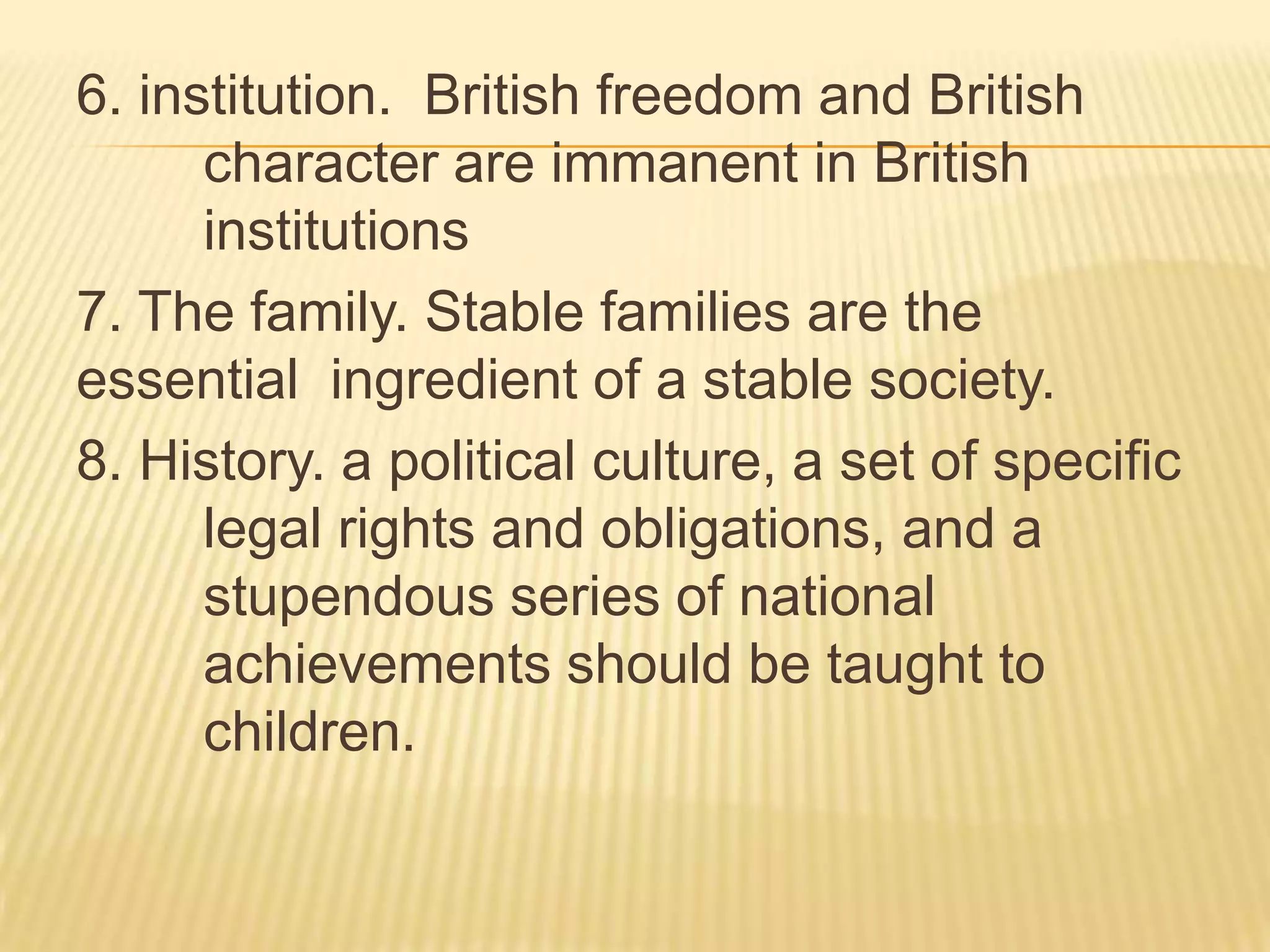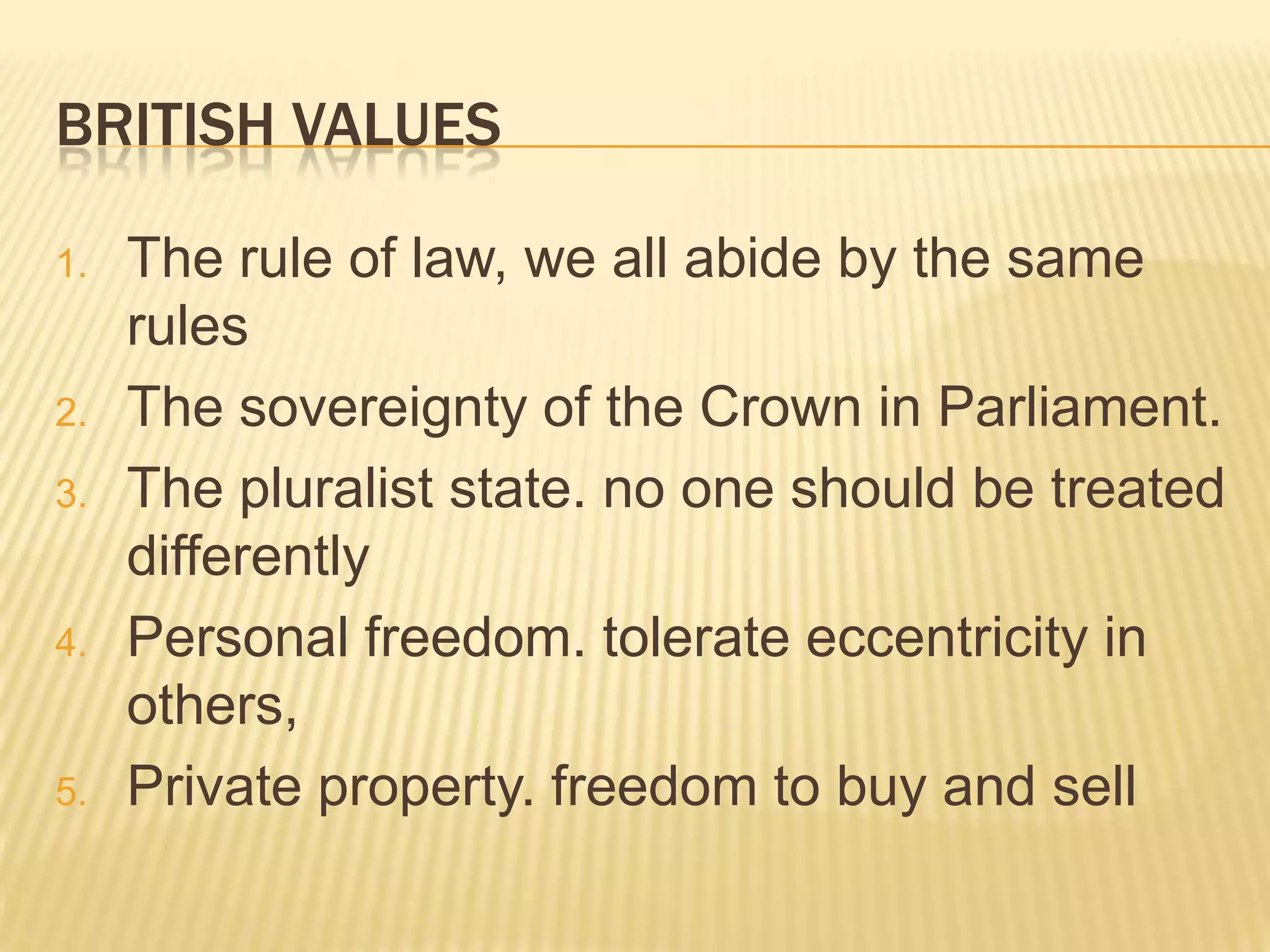 This document outlines 10 key British values: 1) the rule of law, 2) the sovereignty of the Crown in Parliament, 3) the pluralist state with no unequal treatment, 4) personal freedom and tolerance of others, 5) private property rights, 6) the importance of stable British institutions, 7) stable families, 8) teaching history and national achievements to children, 9) shared values with the English-speaking world including freedom and justice, and 10) the British character shaped by institutions emphasizing justice.