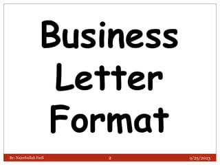 The document discusses the four styles or indentation formats used for writing business letters: full block format, semi-block format, modified block format, and semi-modified block format. It provides details on the formatting conventions for each style, such as whether paragraphs are indented and the positioning of elements like the sender's address, date, closing, signature, and printed name. Examples of each format are also illustrated through sample business letter outlines.