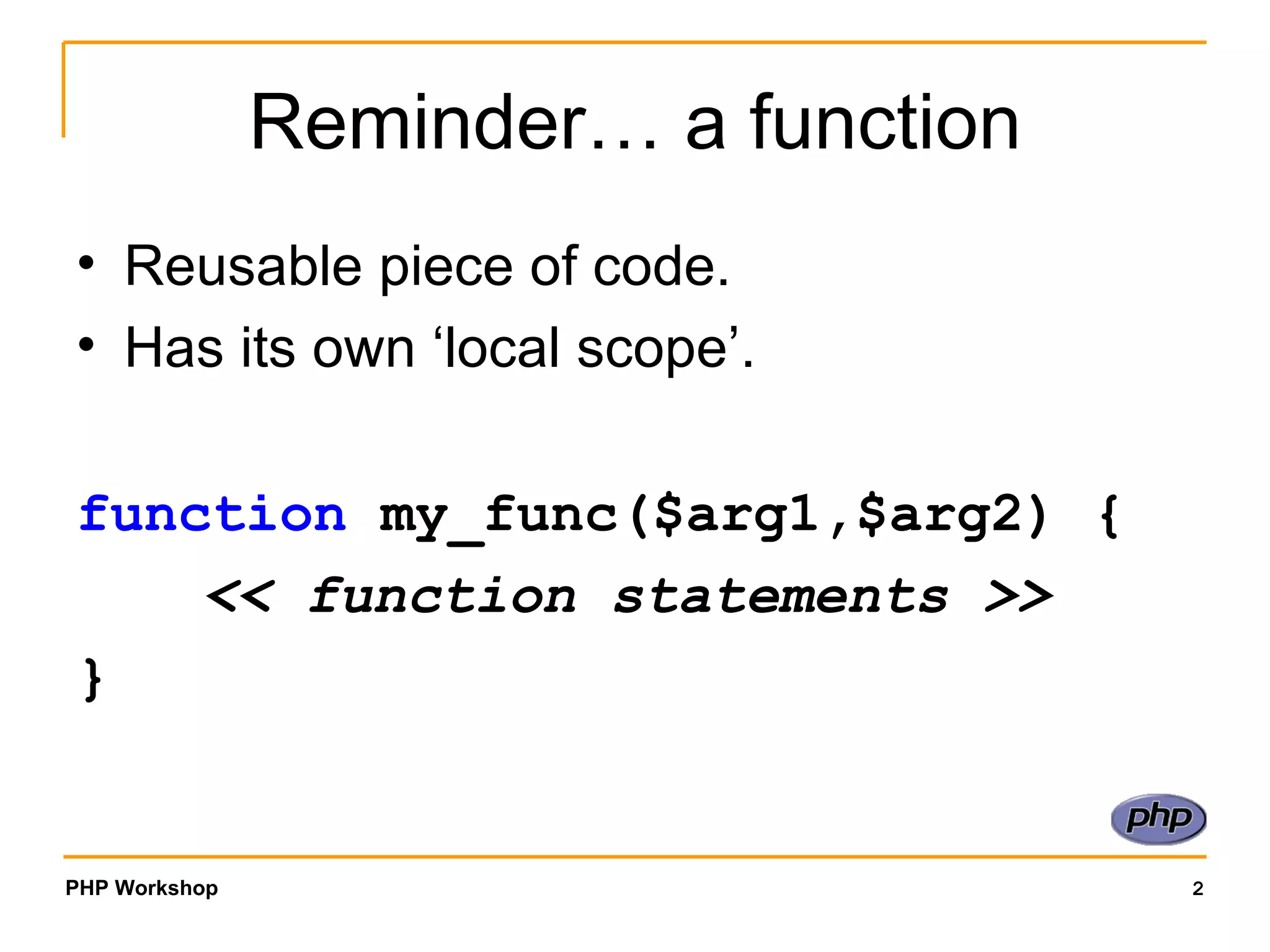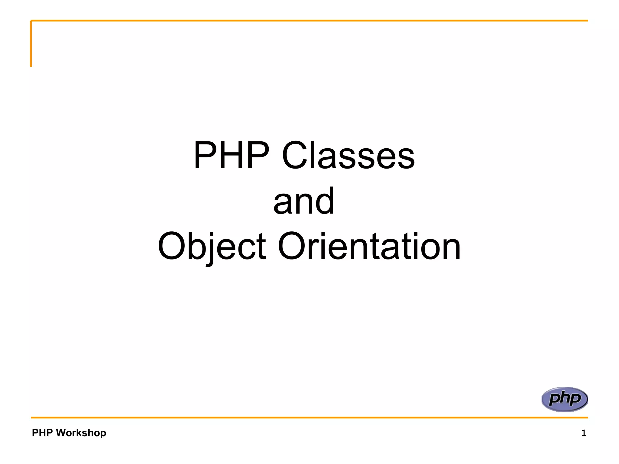 The document discusses object-oriented programming concepts in PHP, including classes, objects, methods, properties, inheritance, and polymorphism. It provides examples of defining classes and using them to instantiate objects. Key concepts covered are class definitions, creating object instances, accessing object properties and methods, and extending classes to create subclass hierarchies.