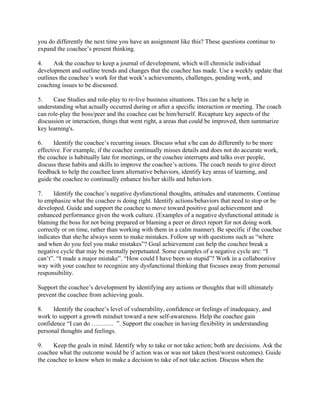 The document outlines ten coaching tips designed to develop employees and enhance their skills and growth. Key strategies include setting goals, engaging coachees with homework, asking insightful questions, and encouraging self-reflection through journaling and role-play. These practices aim to foster awareness, improve behaviors, and guide coachees towards achieving their professional aspirations.