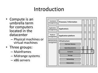 The document provides an overview of compute infrastructure, including: