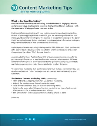 Content marketing involves creating and distributing valuable, relevant and consistent content to attract and engage a target audience with the goal of driving profitable customer action. Unlike traditional marketing, it focuses on engaging customers through useful information rather than direct sales pitches. Research shows most business decision makers prefer educational content over advertisements and feel closer connections to companies that provide it. Creating a content strategy requires understanding audiences, publishing helpful content regularly across channels, measuring effectiveness, and refining efforts continuously.