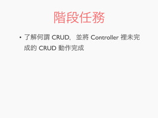 本文件介绍了在 Laravel 工作坊中完成 CRUD 操作的实施细节,包括创建、读取、更新和删除资源的实现方法。文中详细说明了如何配置路由与控制器的对应关系,以及表单数据处理、数据验证和错误处理的步骤。最后,讨论了安全防护、分页和下一步的学习内容。