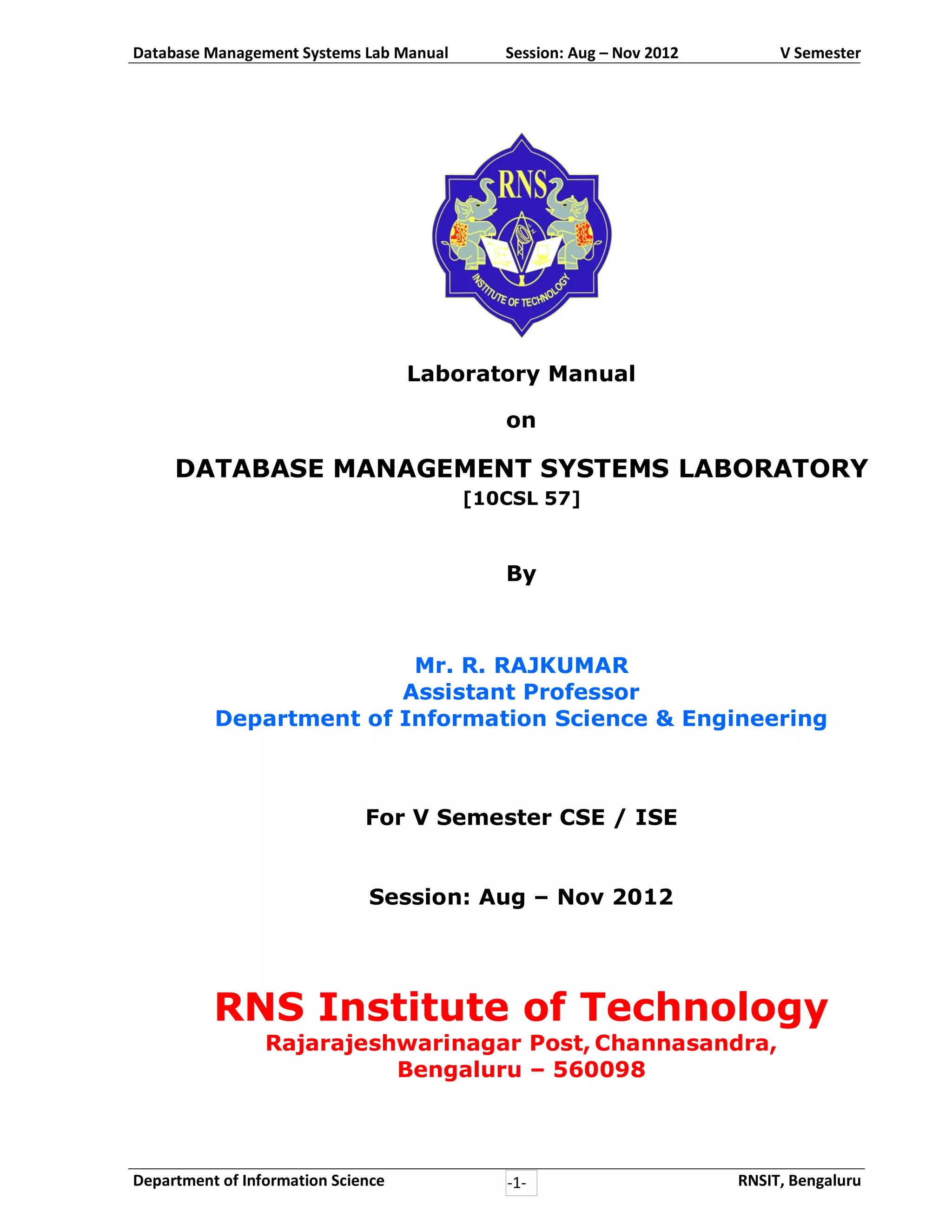 This document is a laboratory manual for a database management systems course covering 5 exercises on modeling relational databases and writing SQL queries. It provides instructions to students on completing the exercises in an RDBMS environment and creating a front-end interface. The exercises involve designing tables, entering sample data, and writing queries over schemas for student records, airline data, books, banking information and more. Students are directed to properly define primary and foreign keys and write queries to return requested information from the different schemas.