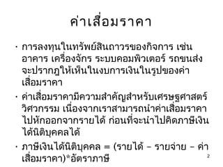• ค่าเสื่อมราคาปีที่ t = (ต้นทุน – มูลค่า
