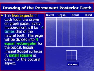 The document provides guidelines for drawing and carving posterior permanent teeth, including premolars and molars. It lists anatomical measurements for upper and lower first and second premolars and first and second molars to accurately depict the size, shape, contours and positioning of cusps, roots, contact areas and other features when drawing or carving teeth. Dimensions are provided for both life-sized natural teeth and enlarged 4x scale models for drawing or smaller-scale carvings. Descriptions and diagrams demonstrate features for the buccal, lingual, mesial, distal and occlusal surfaces of each tooth type.