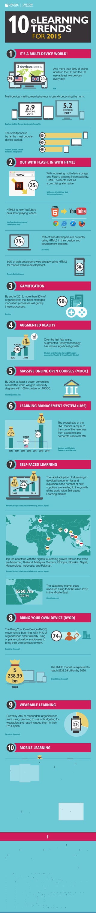Organizations are adopting eLearning at a rate of 13% per year, and this trend is projected to continue through 2017. In 2015, eLearning is expected to expand for learners and organizations. The document discusses trends related to the growing use of multiple devices, HTML5 replacing Flash, gamification, augmented reality, MOOCs, learning management systems, self-paced learning, BYOD, wearable learning, mobile learning, and the eLearning market in the Middle East.