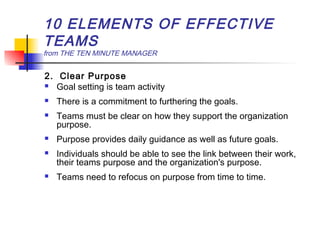 The document outlines 10 elements of effective teams according to The Ten Minute Manager: 1) competent leadership that balances direction and support, 2) a clear purpose that provides daily and long-term guidance, and 3) internal and external focus on relationships. It also discusses the importance of trust, individual performance, problem-solving skills, team spirit, image, and regular review. Effective teams have the right ratios of these elements to maximize performance.