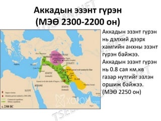 2300-2200 он) Аккадын эзэнт гүрэн нь дэлхий дээрх хамгийн анхны эзэнт гүрэн байжээ. Аккадын эзэнт гүрэн нь 0.8 сая км.кв газар нутгийг эзлэн оршиж байжээ. (МЭӨ 2250 он)