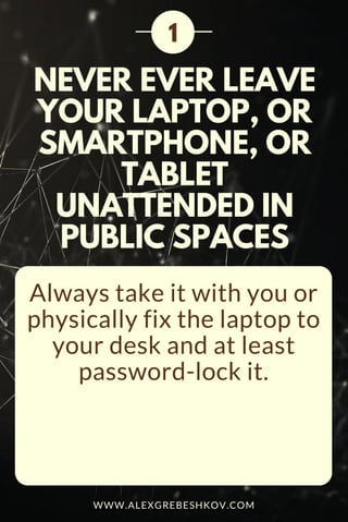 The document provides essential information security tips such as never leaving devices unattended, using strong passwords and 2-step authentication, and keeping software updated. It emphasizes the importance of using encrypted VPN connections, turning off devices when not in use, and managing privacy settings on social media. Additional advice includes avoiding public computers and illegal software to protect against security risks.