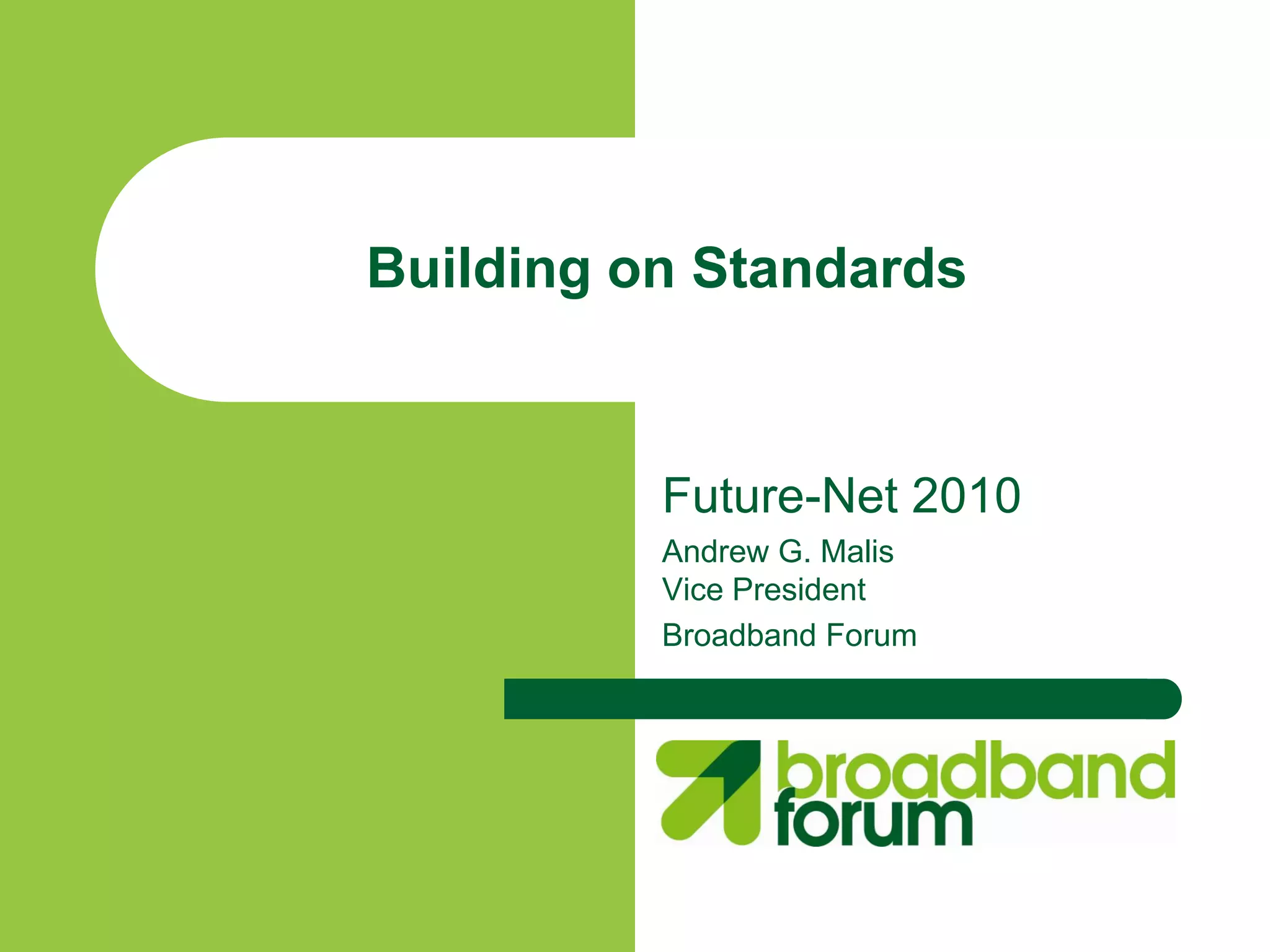 The Broadband Forum is an international standards organization focused on developing specifications to facilitate broadband convergence. The document discusses the Broadband Forum's strategic objectives, including facilitating broadband convergence through common standards, defining common CPE specifications, and ensuring a successful IPv4 to IPv6 migration. It also provides an overview of the Broadband Forum's scope of work, which includes specifications related to broadband management, networks, and users.