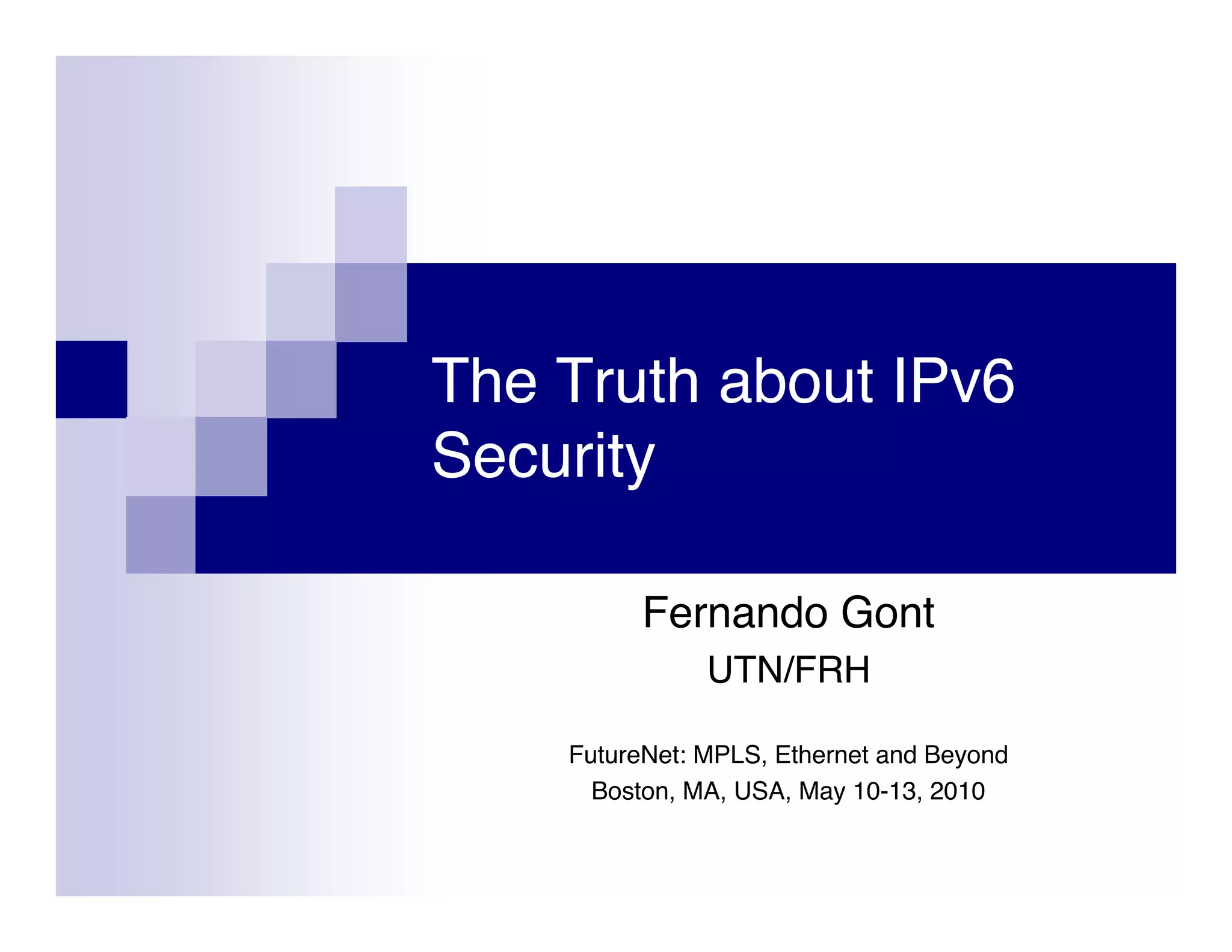 This document discusses the security of IPv6 and addresses some common myths. It provides a brief comparison of IPv4 and IPv6, noting areas of both similarity and difference. While IPv6 introduces some new capabilities like larger addresses and mandatory IPsec support, it also brings new potential security issues from features like stateless autoconfiguration. Proper implementation and ongoing evaluation work is needed to understand IPv6 security as attack surfaces continue to be explored. Transition technologies also introduce new vectors that require consideration. Overall, IPv6 differs little from IPv4 at the network layer, and securing applications and higher layers remains paramount.
