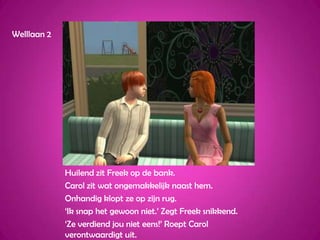 Welllaan 2Huilend zitFreek op de bank.Carol zit wat ongemakkelijk naast hem.Onhandig klopt ze op zijn rug.‘Ik snap het gewoon niet.’ Zegt Freek snikkend.‘Ze verdiend jou niet eens!’ Roept Carol verontwaardigt uit.
