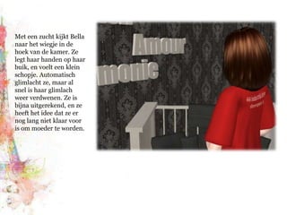 Met een zuchtkijkt Bella naar het wiegje in de hoek van de kamer. Ze legt haar handen op haar buik, en voelt een klein schopje. Automatisch glimlacht ze, maar al snel is haar glimlach weer verdwenen. Ze is bijna uitgerekend, en ze heeft het idee dat ze er nog lang niet klaar voor is om moeder te worden.