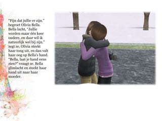 “Fijn dat jullieer zijn.” begroet Olivia Bella. Bella lacht, “Jullie worden maar één keer oudere, en daar wil ik natuurlijk wel bij zijn.” zegt ze. Olivia steekt haar tong uit, en dan valt haar oog op Bella’s hand. “Bella, laat je hand eens zien?” vraagt ze. Bella glimlacht en steekt haar hand uit naar haar moeder.