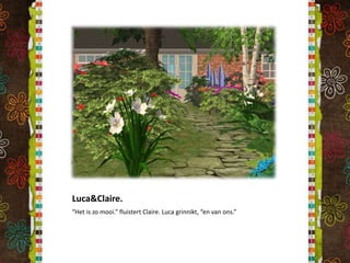 Een hele tijdlater liggen ze samen op het bed. Claire maakt met haar vingers figuurtjes op Luca’s bovenlichaam. “Ik hou van jou.” zegt Luca. Claire glimlacht en kijkt hem aan. “ik ook van jou.”