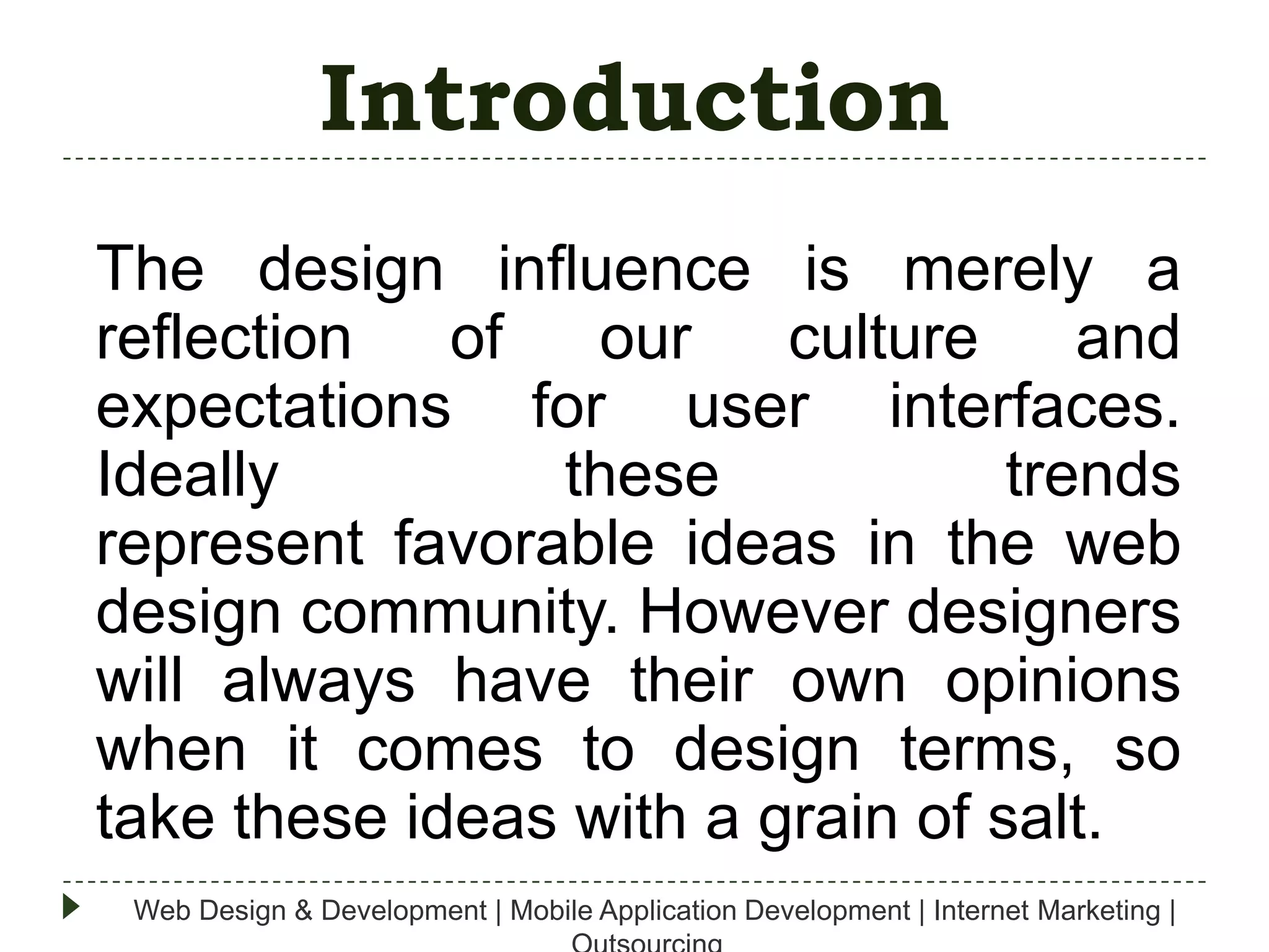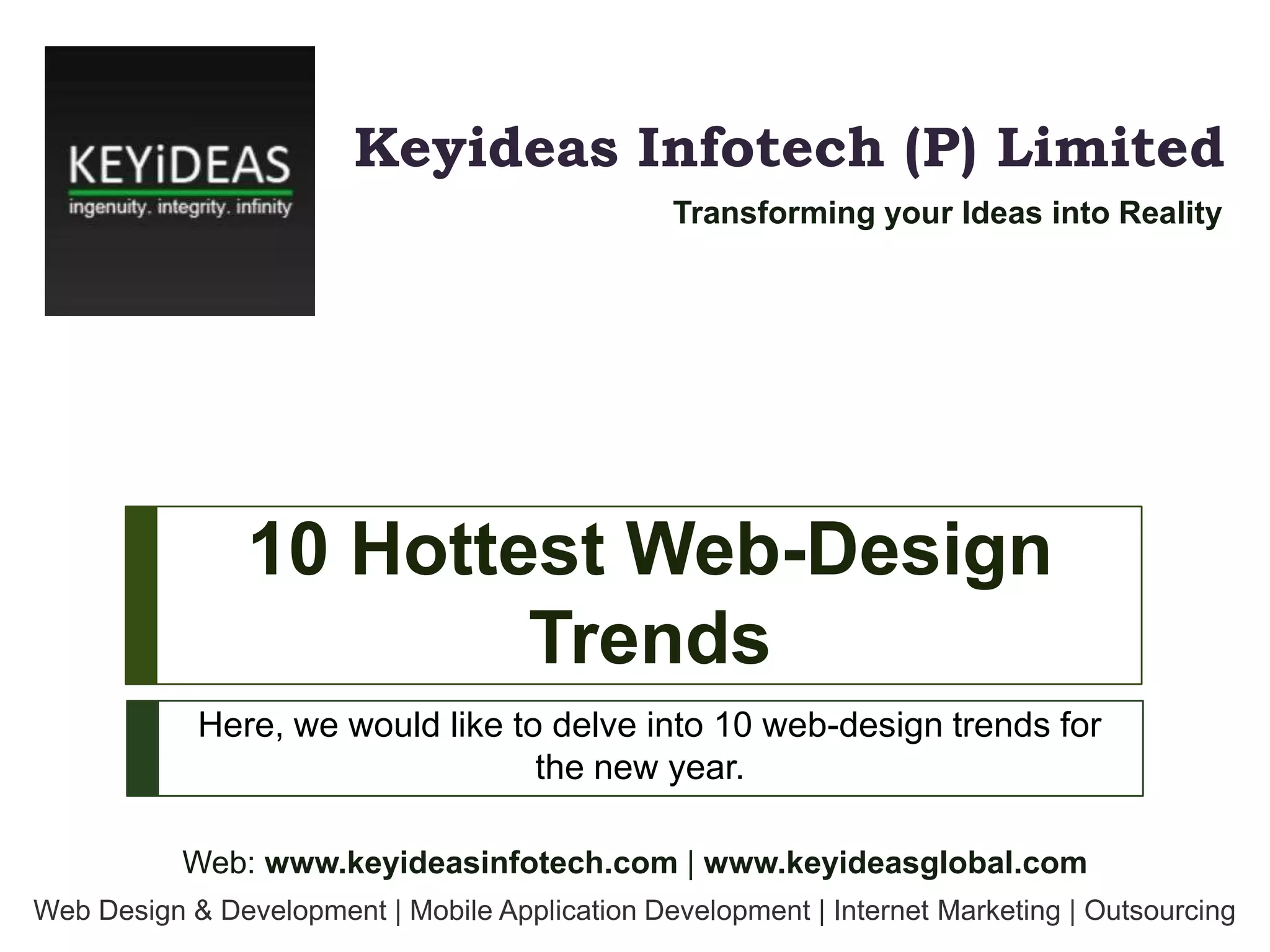 The document discusses 10 web design trends for the upcoming year, emphasizing the importance of design as a reflection of culture and user expectations. Key trends include responsive layouts, retina support, fixed header bars, and minimalist landing pages, among others. Additionally, it highlights services offered by Keyideas Infotech, such as website design, development, and internet marketing.