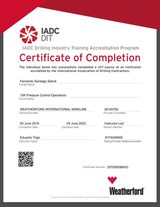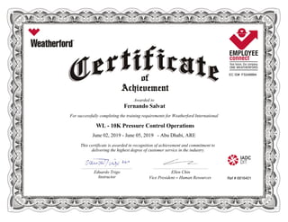Fernando Salvat completed training requirements for Weatherford International's 10K Pressure Control Operations from June 2-5, 2019 in Abu Dhabi, United Arab Emirates. The certificate recognizes his achievement in training and commitment to providing excellent customer service in the industry. It was issued by his instructor Eduardo Trigo and signed by the Vice President of Human Resources Ellen Chin.