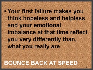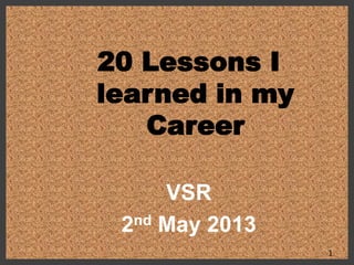 The document outlines 21 lessons learned over a career, including that one's first failure can cause feelings of hopelessness but does not define you, volunteering provides great learning opportunities, and it is important to get the best from ordinary people available. Additional lessons include being mindful of body language, not expecting 100% acceptance from a team but prioritizing the organization, overcoming fears through practice, listening before leading after joining a new company, managing negative forces, trusting oneself when thinking big, and taking on leadership roles only with the right strengths.