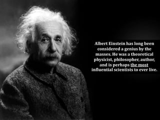 Albert Einstein was a renowned theoretical physicist and philosopher who made many significant contributions to scientific fields like physics and cosmology. The document outlines 10 life lessons learned from Einstein, including following your curiosity, persevering through problems, focusing on the present, using imagination, making mistakes to learn, living in the moment, creating value for others, expecting to change methods for different results, gaining knowledge through experience, and learning rules while excelling at any given task.