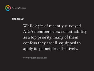 The Living Principles for Design aim to provide designers with an integrated framework to effectively apply sustainability principles. It distills decades of sustainability theories into an actionable quadruple bottom-line approach that addresses environmental protection, social equity, economic health, and cultural vitality. For each area, it outlines the design opportunity and provides roadmaps for designers with considerations and guidelines to integrate sustainability into their work. The principles are intended to be a starting point and feedback is sought to keep them relevant for the design community.