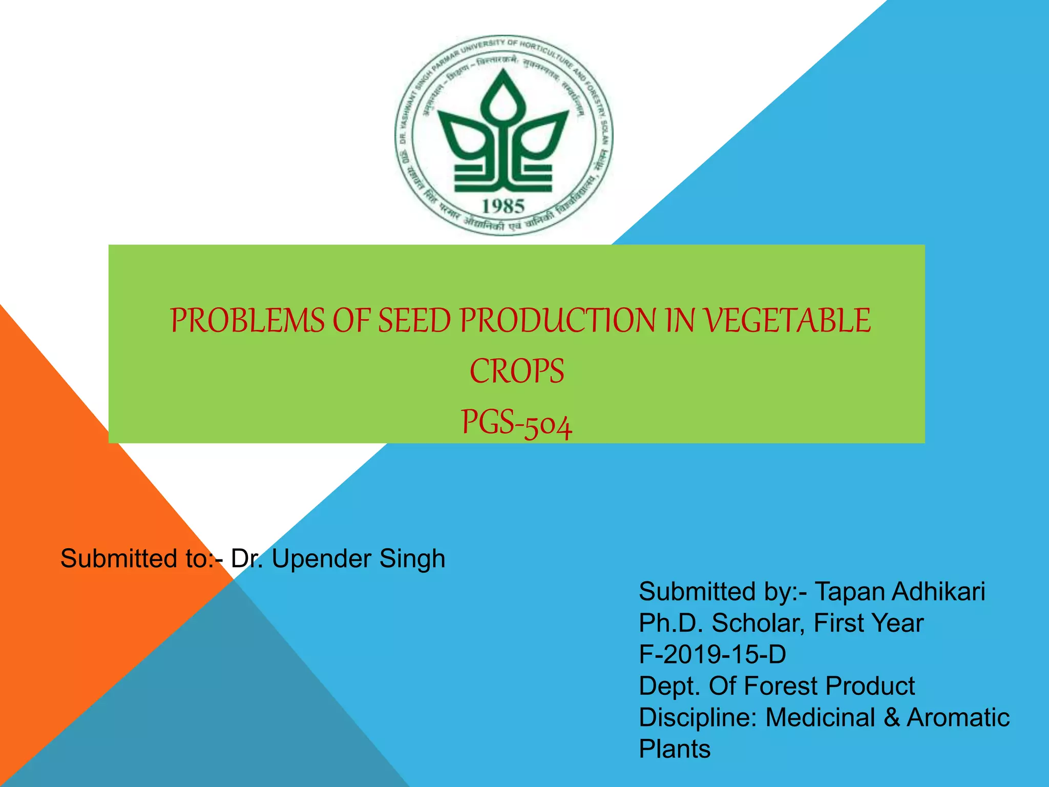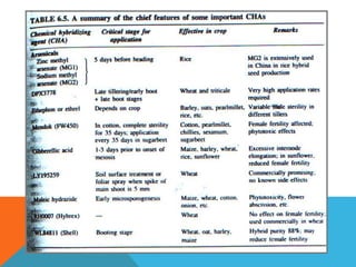 This document discusses different methods of hybrid seed production in vegetable crops, including hand emasculation and pollination, male sterility systems, self-incompatibility, and gynoecism. It provides details on the principles, techniques, advantages, and limitations of each method. Cytoplasmic, genic, and cytoplasmic-genic male sterility systems as well as environmental genic male sterility and chemically induced male sterility are described. Gametophytic and sporophytic self-incompatibility systems are also explained. Hybrid seed production methods including single cross, double cross, and triple cross techniques are outlined.