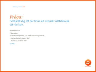 Beställa böcker. Frågasaker. Använda betaltjänster, t ex ladda ner tidningsartiklar. ...Vad skulle du tycka om det? ...Skulle du använda det? SVAR: Fråga: Föreställ dig att det finns ett svenskt nätbibliotek där du kan: Skräddarsytt bibliotek 2009
