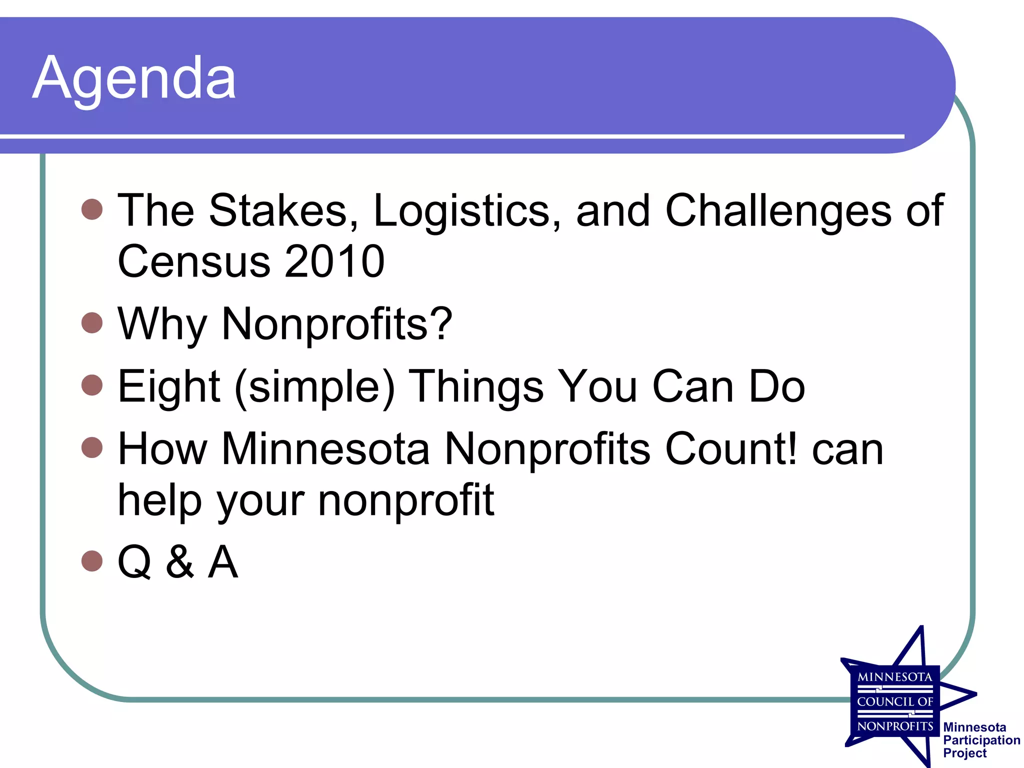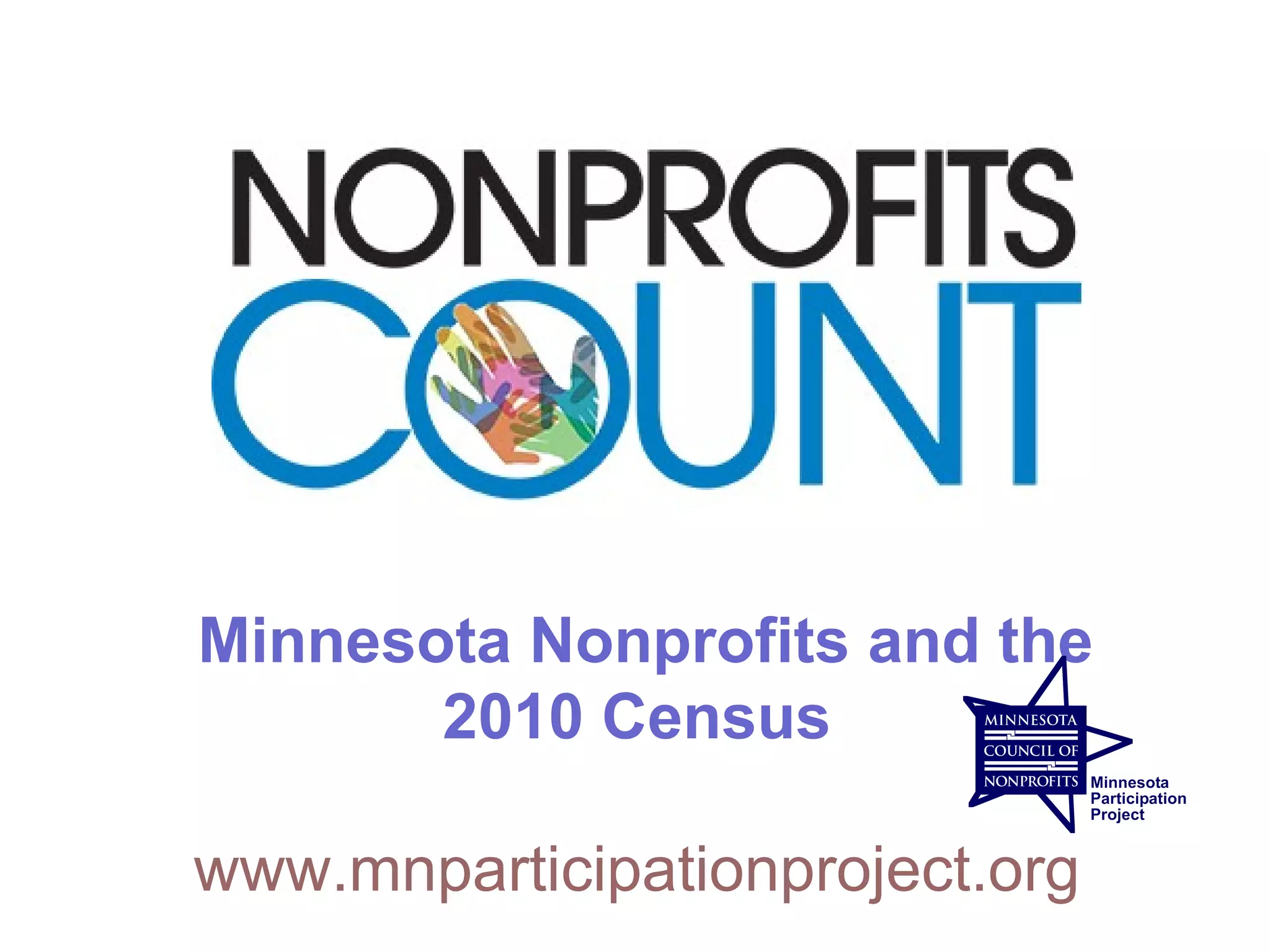 This document discusses the importance of the 2010 U.S. Census for Minnesota and outlines ways for nonprofits to help ensure an accurate count. Key points include: the census determines federal funding and political representation for the next decade; groups at risk of being undercounted; challenges in achieving an accurate count; and eight simple actions nonprofits can take such as partnering with the Census Bureau, distributing promotional materials, and hosting community events. The Minnesota Nonprofits Count initiative provides resources and support to help nonprofits engage their communities in the census.