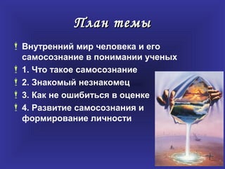 Документ посвящен самопознанию и развитию личности на уровне 10 класса и исследует внутренний мир человека и его самосознание через призму мнений ученых. Рассматриваются ключевые понятия, такие как самоосознание, самооценка, идентичность и самореализация, а также этапы, важные для формирования личности. Важное внимание уделяется тому, как человек осознает себя и какие факторы влияют на самооценку и развитие идентичности.