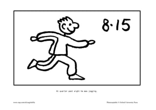 The document describes a man's daily schedule in half hour increments, noting that at 7:00 he was sleeping, 8:30 he was jogging, 9:00 he had breakfast, 11:30 he was working, 16:00 he watched TV, and 22:15 he played the saxophone.