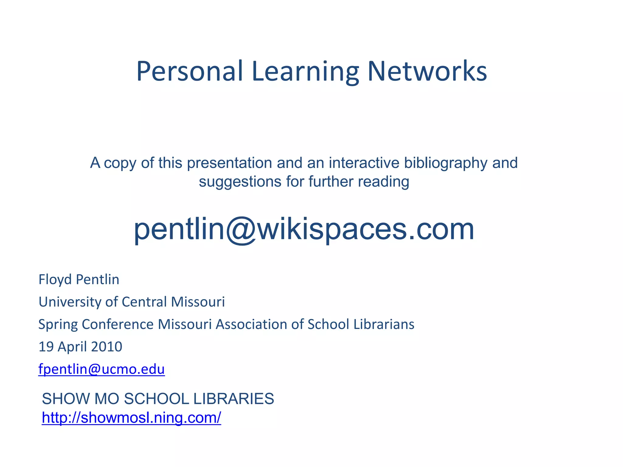 This document discusses personal learning networks (PLNs) and how individuals can develop their own PLNs to facilitate lifelong learning. It defines a PLN as a self-managed collection of online resources that allow individuals to organize and share information. It provides examples of different tools that can be used to develop a PLN, including blogs, social networking sites, RSS feeds, and content aggregation platforms. It emphasizes that a PLN is learner-centered and supports learning that is lifelong, life-wide, and available on demand.