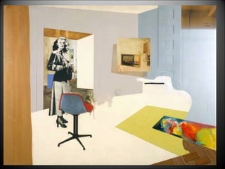 Les bases delPop Art sorgeixen de l’interès que desperten alguns artistes que, com Hamilton, Paolozzi, Rauschenberg o Johns per les imatges d’objectes d’ús habitual impulsats pels mitjans de comunicació de masses. Aquest collage de Richard Hamilton ¿ Qué es lo que hace que los hogares de hoy sean tan diferentes, tan llamativos?, es considera la primera obra pop, mostrada per primera vegada en l’exposició AIXÒ ÉS EL DEMÀ a la Whitechapel Gallery de Londres en 1956. Els inicis del Pop Art