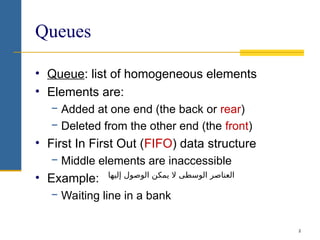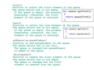 This document explains the concept of queues in C++, detailing the structure, operations, and implementation of queues using arrays. It covers how elements are added and deleted following the first-in-first-out principle, and introduces considerations for handling full and empty queues. Various solutions are discussed, including circular array implementation and maintaining a count of elements for efficient management.