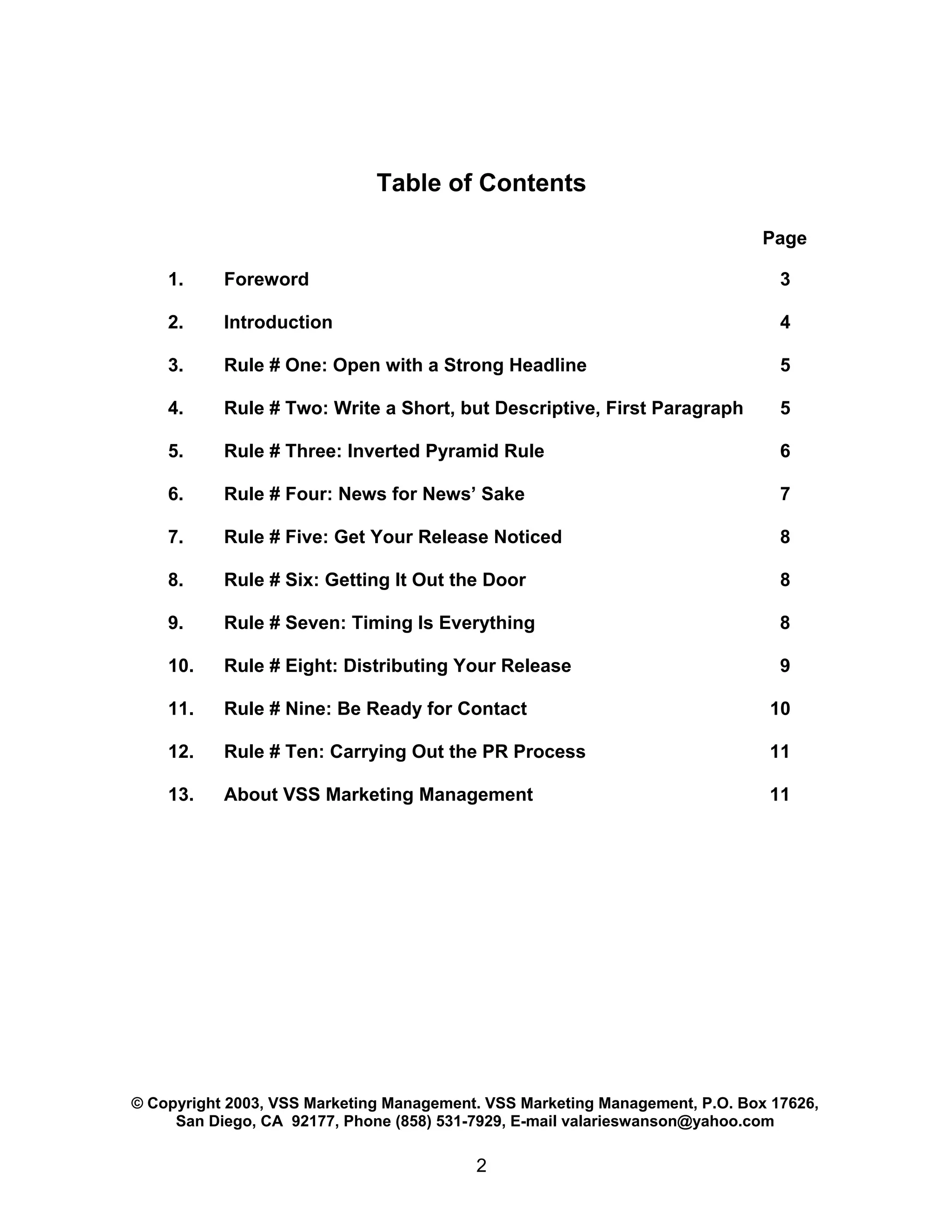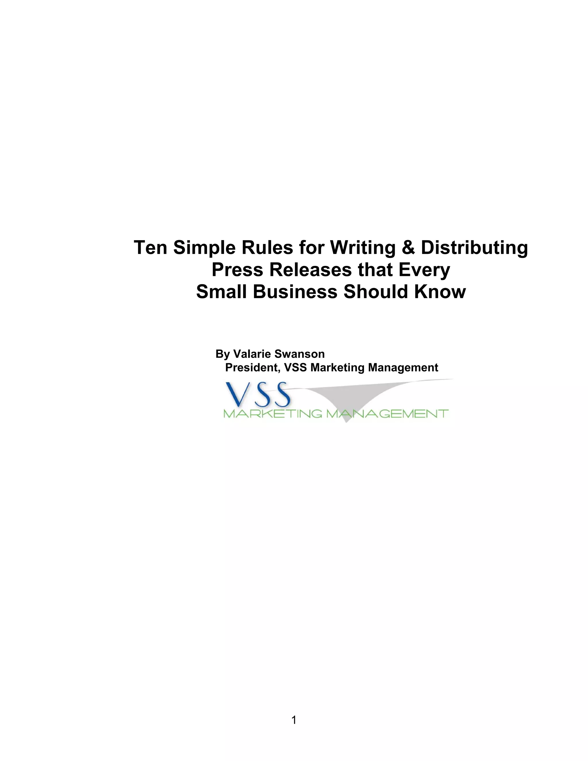 The document outlines ten essential rules for small businesses to write and distribute effective press releases, emphasizing the importance of a strong headline, concise content, and timely distribution. It provides actionable advice on crafting interesting releases, utilizing visuals, and being responsive to media inquiries. Following these guidelines can enhance visibility and improve engagement with the press, ultimately benefiting the business's marketing efforts.