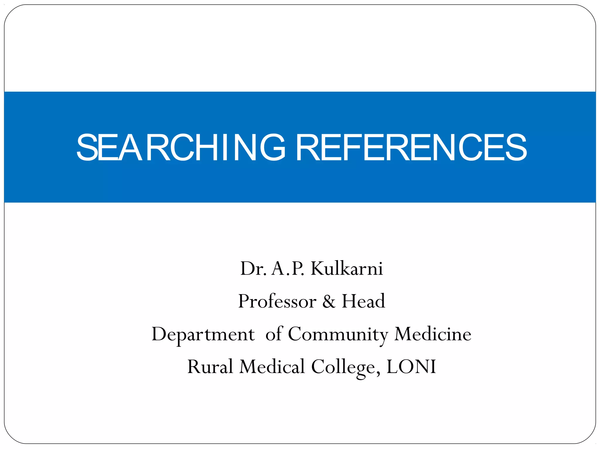 The document discusses various methods and resources for searching references, both traditional and modern. It begins by describing how references were searched in the past through indexes, books, and discussions with seniors. Now, internet and websites are commonly used for reference searching. The document then focuses on PubMed, outlining what it is, how to access and search it, and how to solve common problems like getting too many/few results or finding recent or single citations. It also discusses finding full text articles and filters. Finally, it lists additional useful medical and health-related websites and databases.
