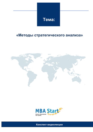 Документ представляет собой конспект видеолекции по методам стратегического анализа, включая анализ факторов дальнего и ближнего окружения. Он охватывает такие инструменты, как PEST-анализ и модель пяти сил конкуренции Майкла Портера, а также описывает процесс анализа сильных и слабых сторон компаний. В заключении приводятся рекомендации по выполнению практических заданий для более глубокого понимания материалов курса.