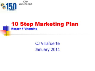 Restor-F vitamins targets "energy seeking teens and adults" who want to be active, free from disease, and have improved function. It competes with Centrum, Clusivol, and Enervon but positions itself as the only multivitamin that contains taurine, chlorella, ginseng, rutin, folic acid, and lecithin. The Philippine vitamin market is estimated at $2 billion, and Restor-F aims for a 0.5% market share of $10 million. Restor-F is a premium priced softgel capsule promoted through the internet and distributed nationwide using a differentiation strategy.