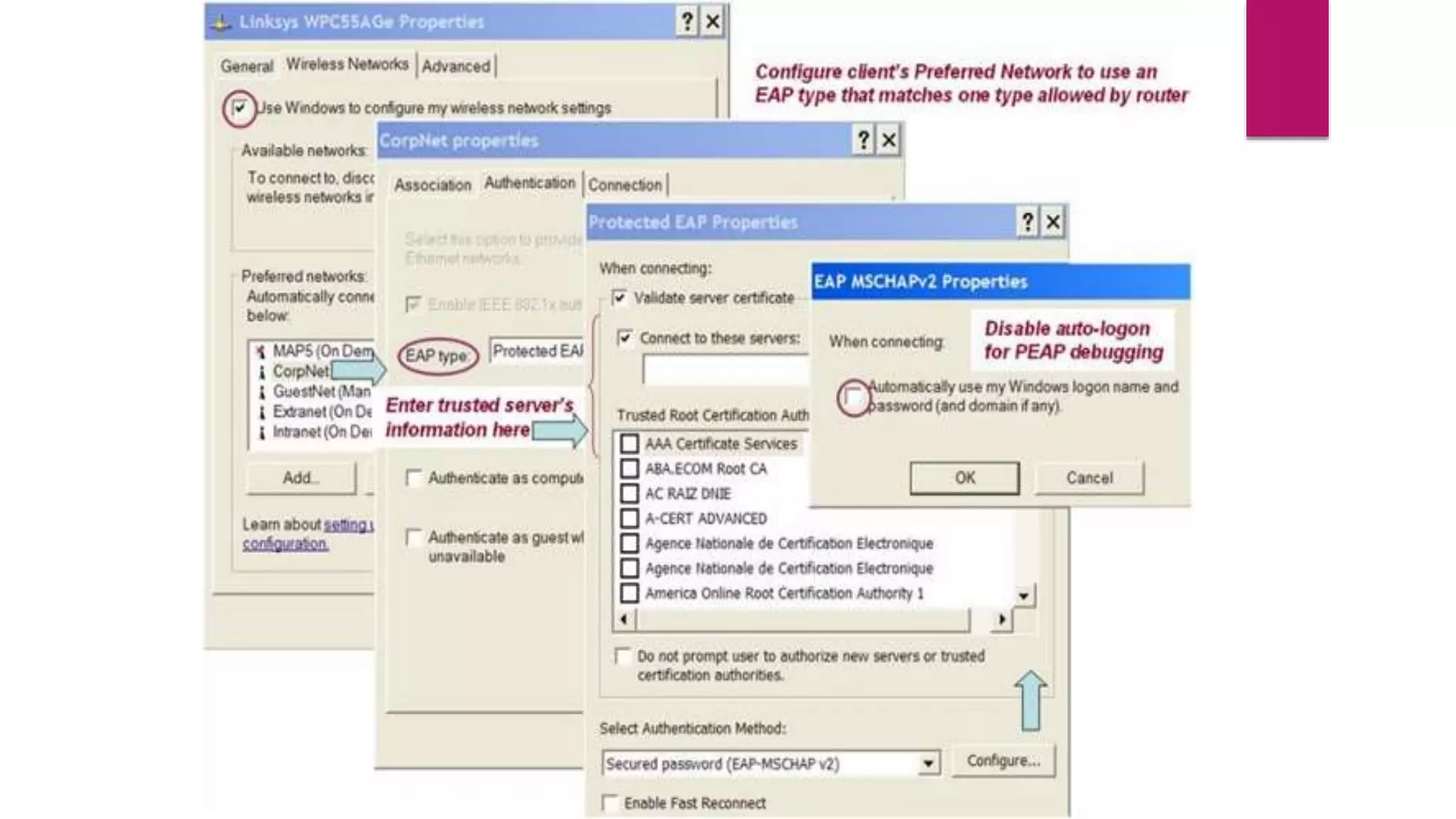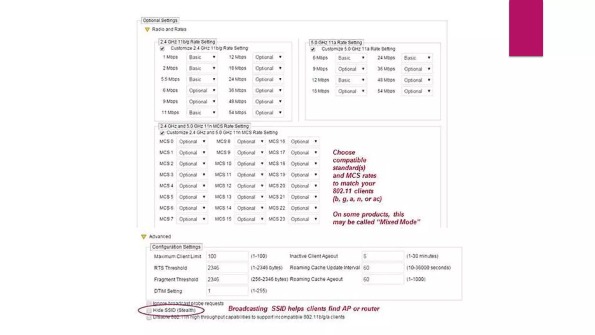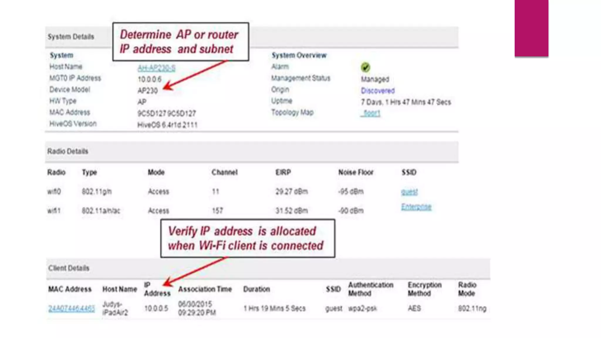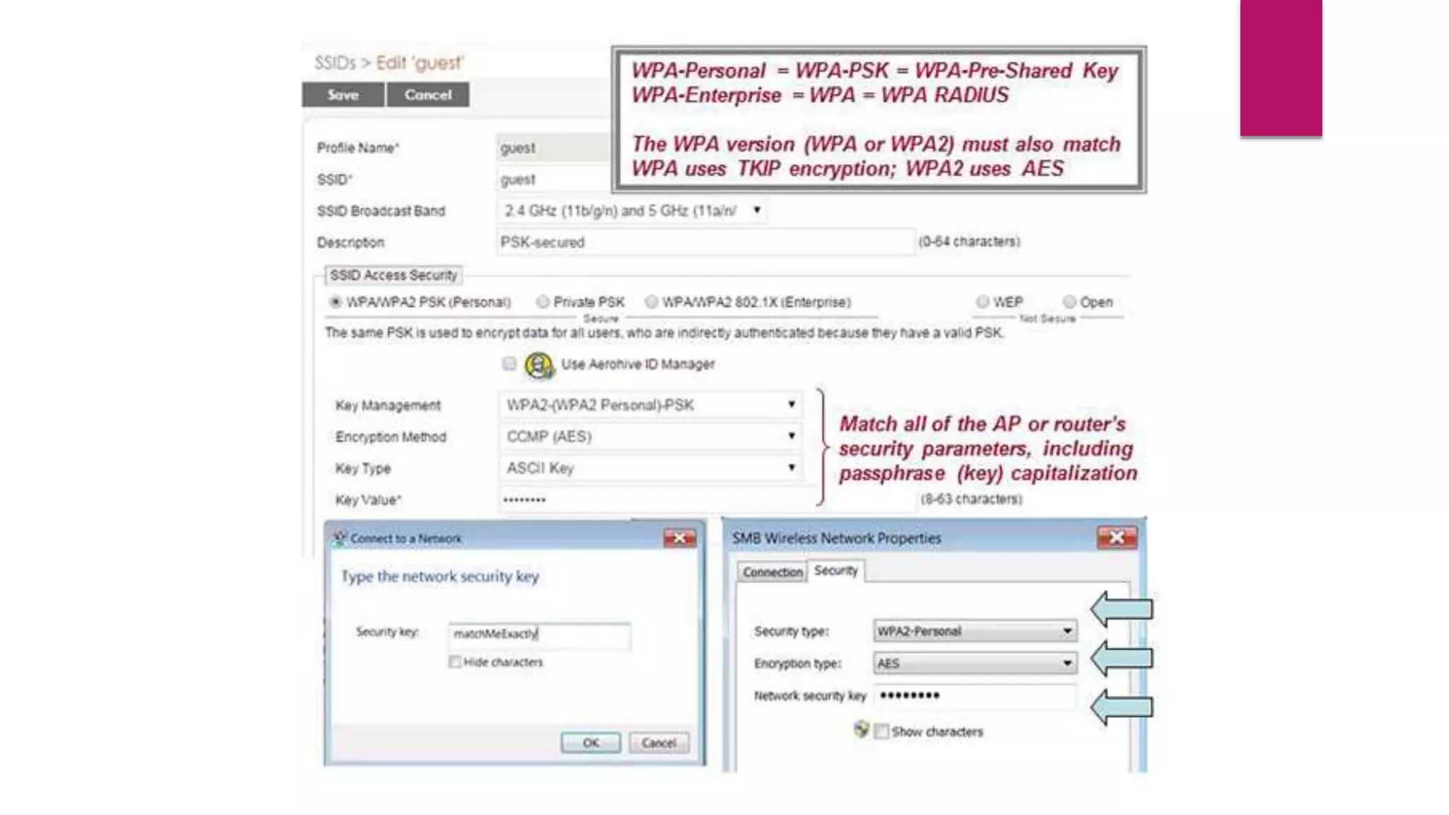3. Check the wireless access point settings like the SSID name and security settings match the client device.