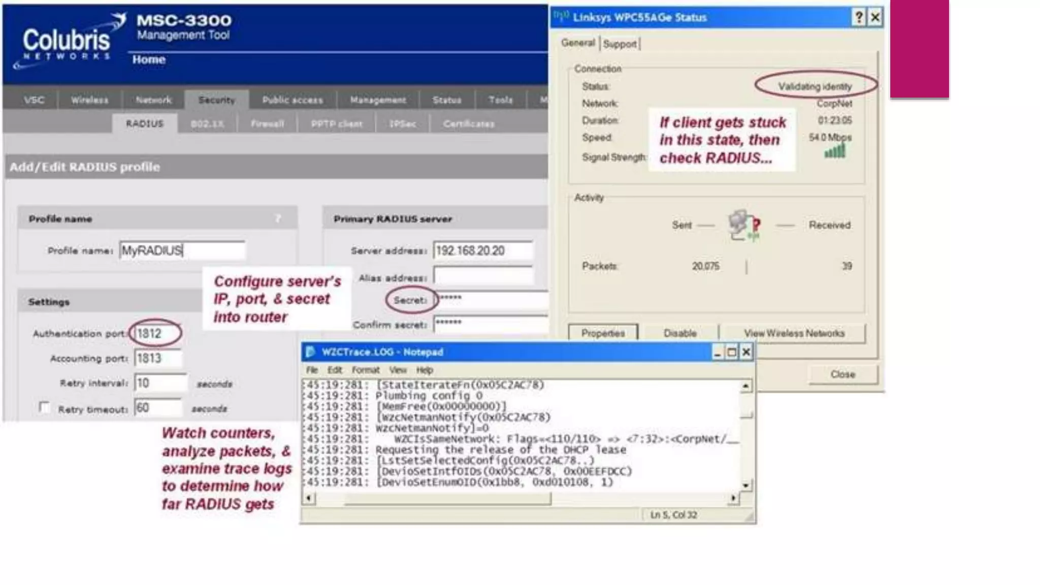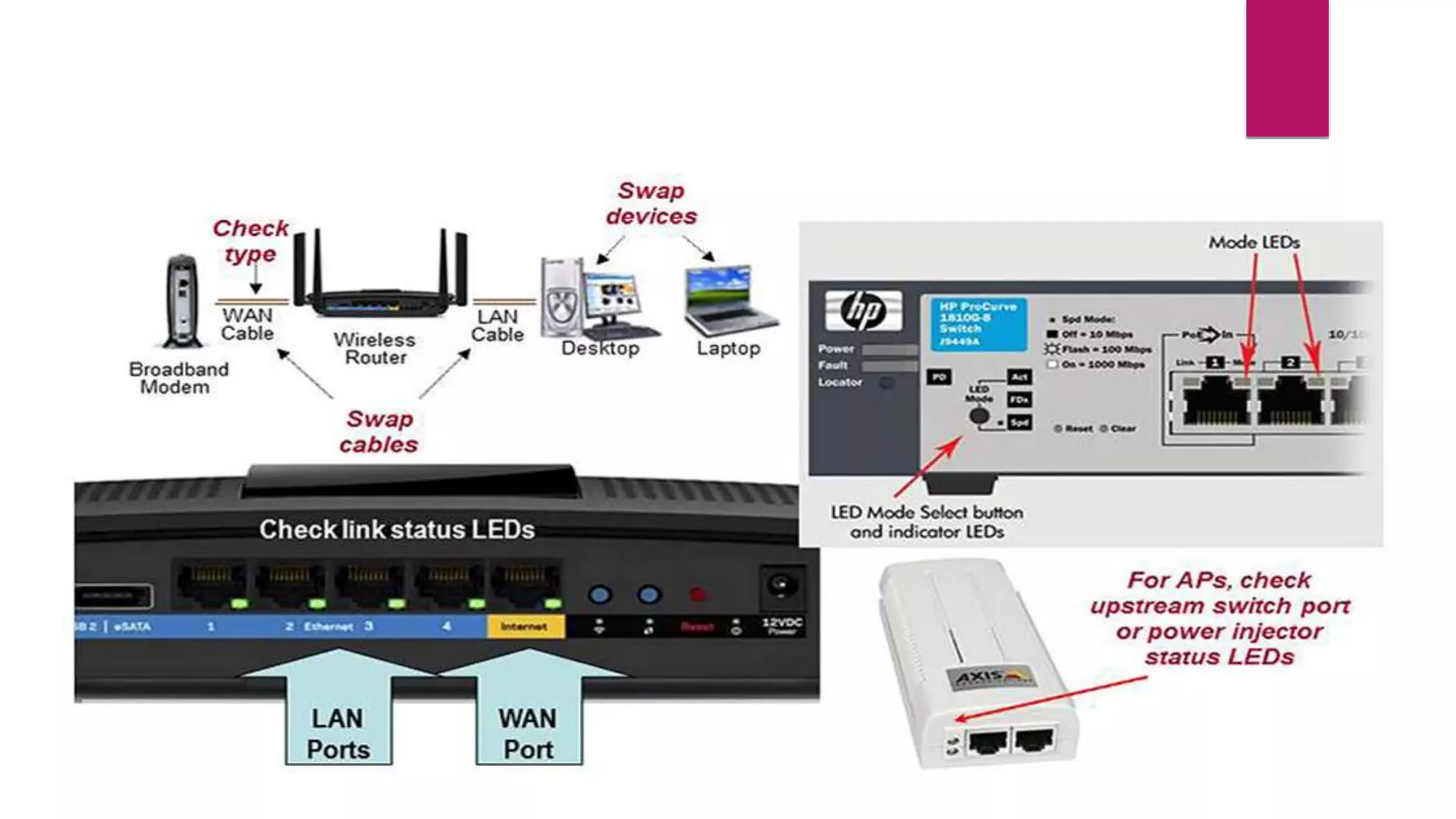 1. Check wired LAN connections to the wireless access point and ensure link status lights are on.